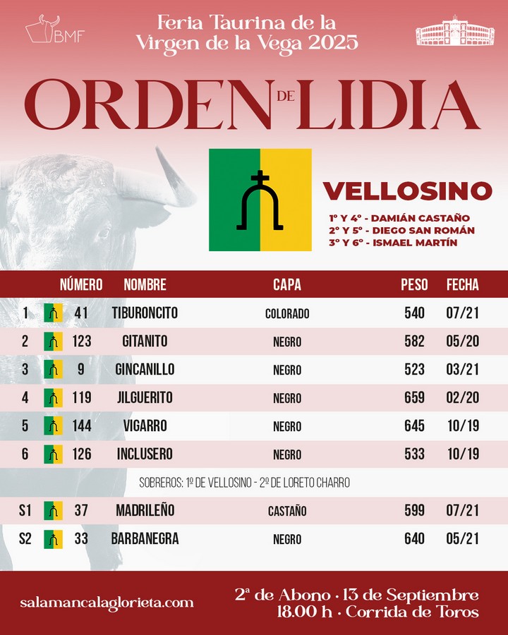 Orden de lidia de los toros de Vellosino para Salamanca