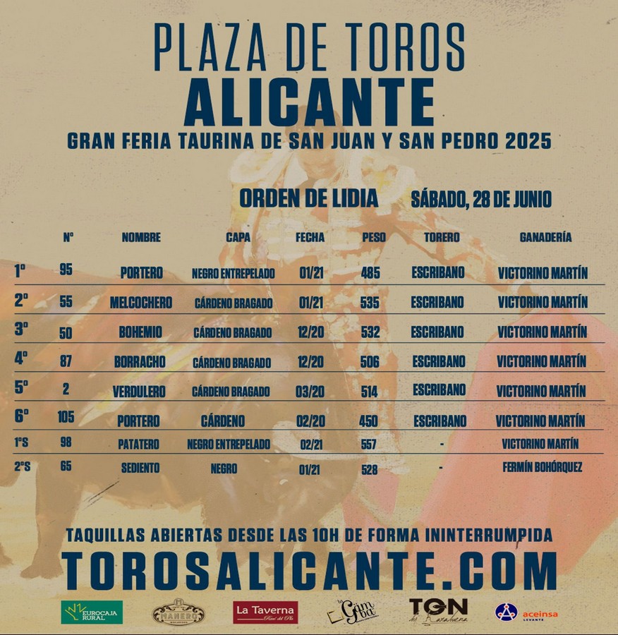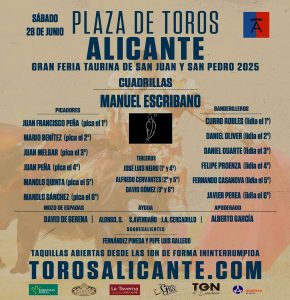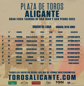 28 Jun ActualidadOrden de lidia de los ‘Victorinos’ para la gesta de Manuel Escribano Posted on 28/06/202528/06/2025 by Redacción Orden de lidia de los ‘Victorinos’ para la gesta de Manuel Escribano El diestro de Genera se enfrentará en solitario a un encierro de Victorino Martín en Alicante Orden de lidia y cuadrillas Orden de lidia de los 'Victorinos' para la gesta de Manuel Escribano Orden de lidia de los 'Victorinos' para la gesta de Manuel Escribano Eventos Mare Nostrum Redacción Presentado el Premio Provincial de Tauromaquia de Burgos Los toros de Miura para hoy en Algeciras