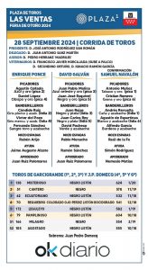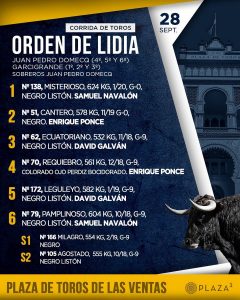 Esta tarde arranca la Feria de Otoño en Las Ventas. En este primer festejo se lidiarán astados de Garcigrande y Juan Pedro Domecq para Enrique Ponce, que se despedirá de Madrid, David Galván y Samuel Navalón, que confirmará su alternativa