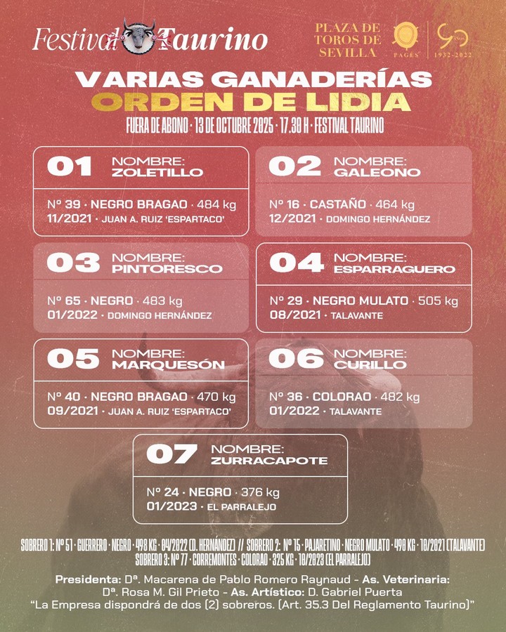 Orden de lidia para el festival benéfico de hoy en Sevilla