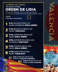 Seis toros de Domingo Hernández aguardan ya en los chiqueros de la Plaza de Toros de Valencia para la novena de abono de la Feria Taurina de Fallas. A las 17h. la afición valenciana asistirá al mano a mano de Borja Jiménez y Tomás Rufo.