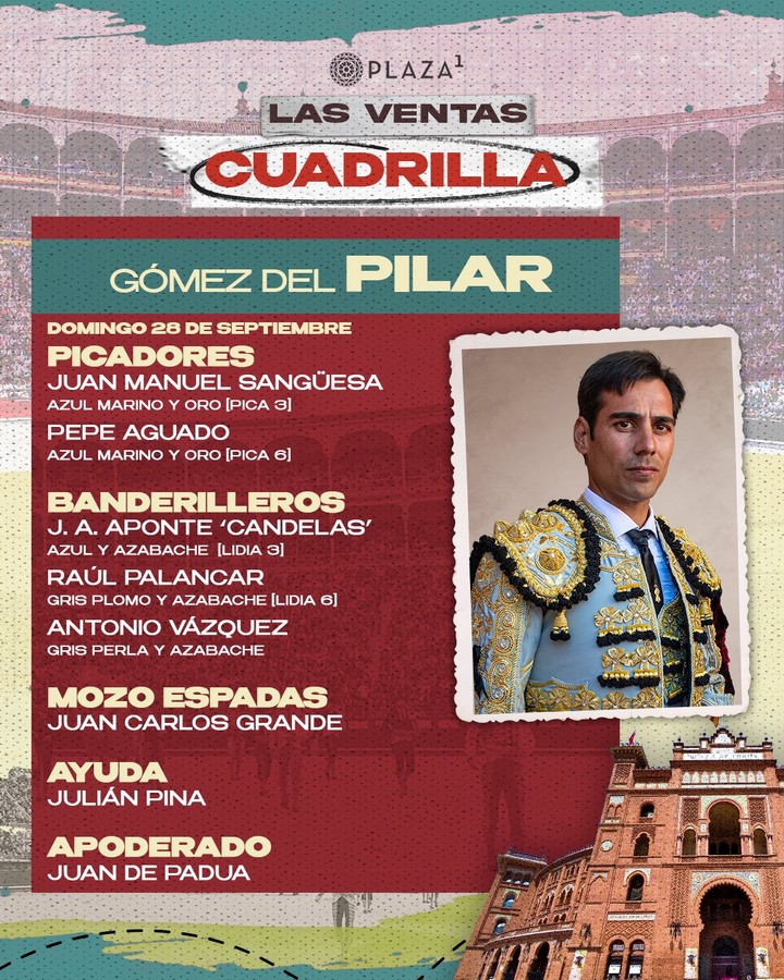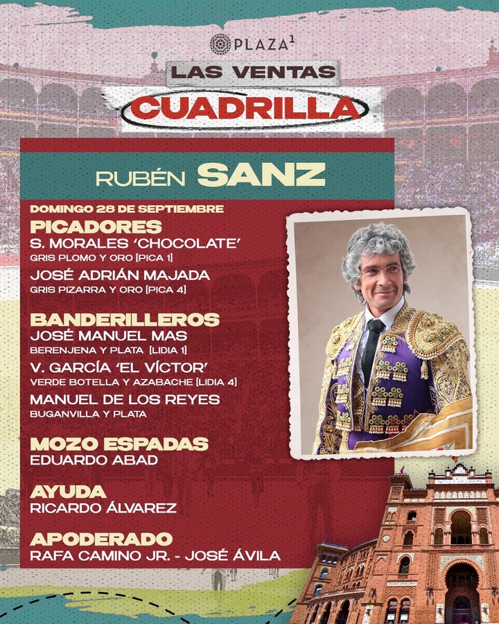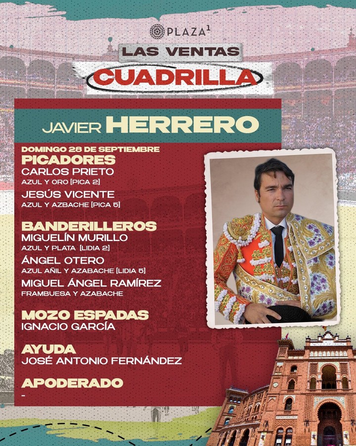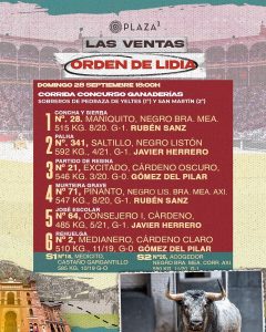 28 Sep ActualidadOrden de lidia para la corrida concurso de Madrid Posted on 28/09/202528/09/2025 by Redacción Orden de lidia para la corrida concurso de Madrid El cartel anuncia a los diestros Rubén Sanz, que confirma alternativa, Javier Herrero y Gómez del Pilar Orden de lidia, cuadrillas y fotos de los toros Orden de lidia para la corrida concurso de Madrid Orden de lidia para la corrida concurso de Madrid Orden de lidia para la corrida concurso de Madrid Orden de lidia para la corrida concurso de Madrid Orden de lidia para la corrida concurso de Madrid Orden de lidia para la corrida concurso de Madrid Orden de lidia para la corrida concurso de Madrid Orden de lidia para la corrida concurso de Madrid Vídeo Plaza 1 Redacción Los toros de Núñez del Cuvillo para la alternativa de Javier Zulueta ‘Jalado’, de Fuente Ymbro, abre la gesta de Curro Díaz en Úbeda