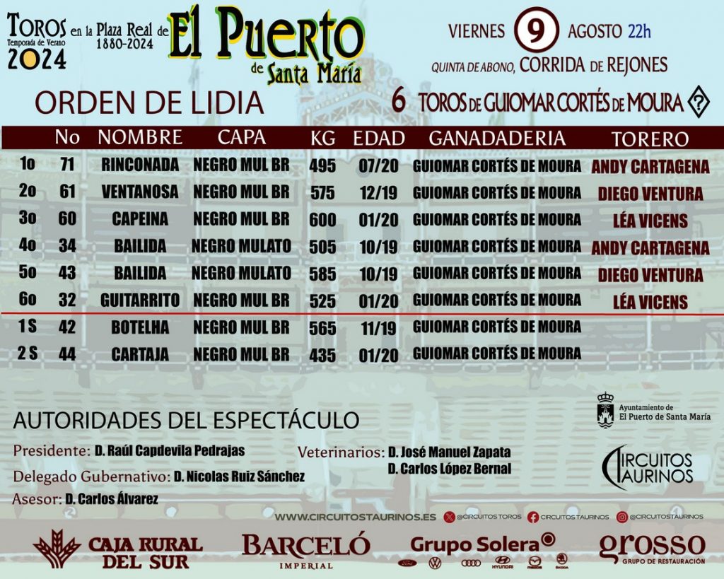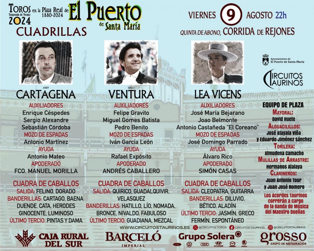 Quinto festejo de la temporada de verano en El Puerto de Santa María. Se lidian reses de María Guiomar Cortés de Moura para una terna de rejoneadores integrada por Andy Cartagena, Diego Ventura y Lea Vicens