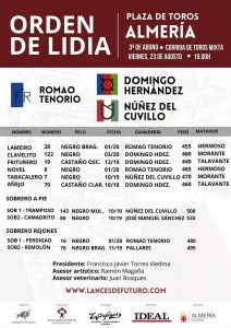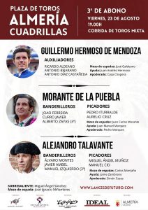 Tercera y última corrida de la Feria de la Virgen del Mar de Almería, en la que están anunciados el rejoneador Guillermo Hermoso de Mendoza y los diestros Morante de la Puebla y Alejandro Talavante