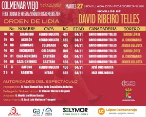 La Plaza de Toros de «La Corredera» de Colmenar Viejo acoge esta tarde el cuarto festejo de la Feria de Nuestra Señora de los Remedios, que es una novillada picada. David López, Alejandro Chicharro y Javier Zulueta darán cuenta de los utreros de David Ribeiro Telles