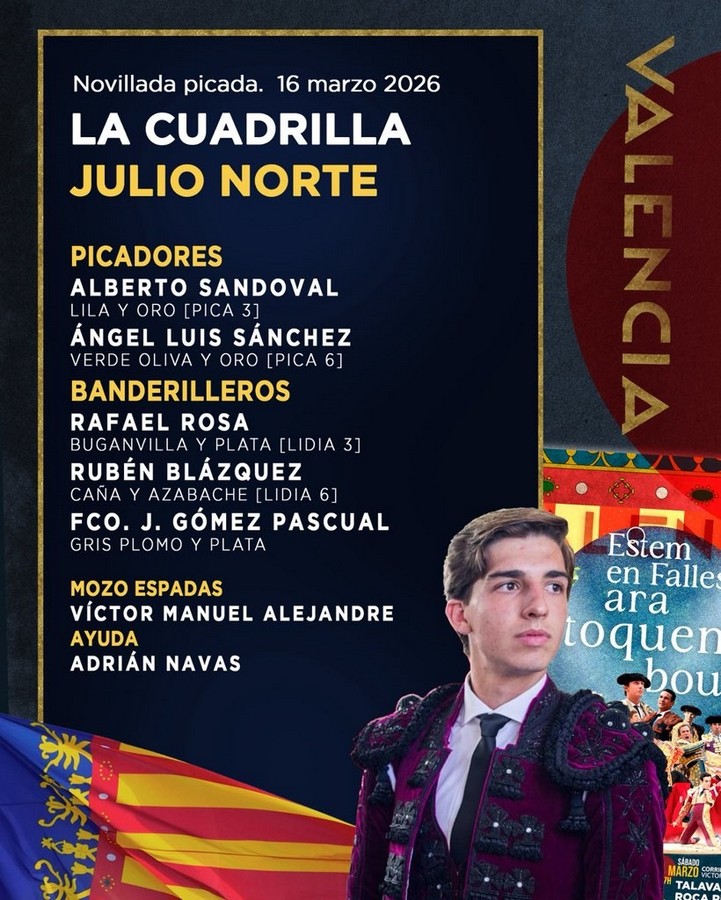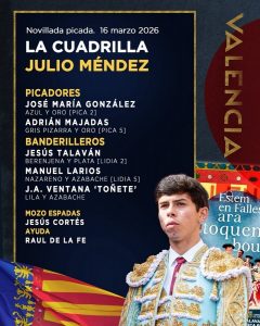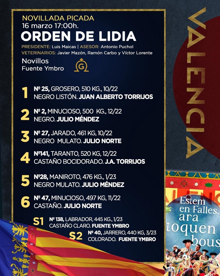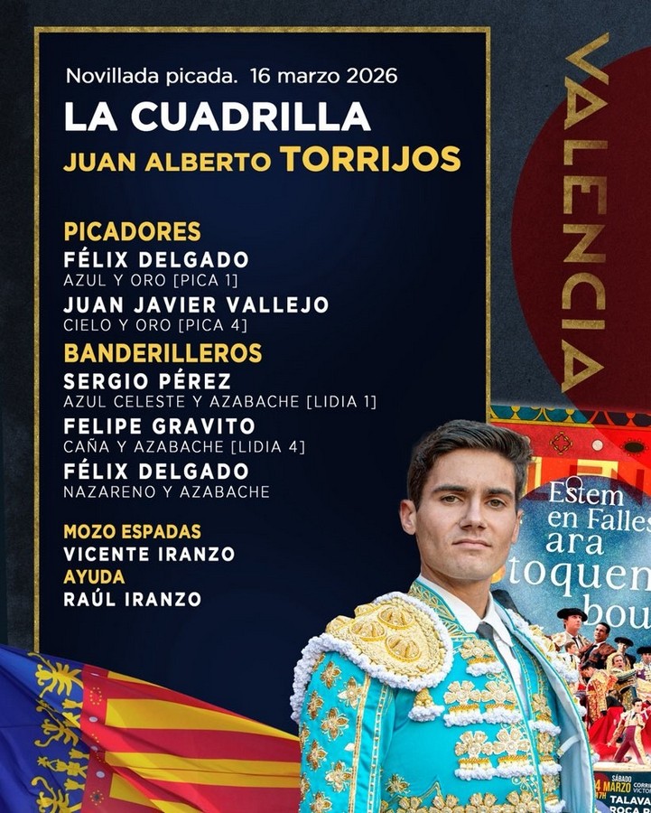16 Mar ActualidadOrden de lidia para la novillada de hoy en Valencia Posted on 16/03/202616/03/2026 by Redacción Orden de lidia para la novillada de hoy en Valencia Se anuncian Juan Alberto Torrijos, Julio Méndez y Julio Norte Orden de lidia y cuadrillas Orden de lidia para la novillada de hoy en Valencia Orden de lidia para la novillada de hoy en Valencia Orden de lidia para la novillada de hoy en Valencia Orden de lidia para la novillada de hoy en Valencia Redacción El ganadero Luis Cuadri ante el regreso a Las Ventas José Germán y Jorge Hurtado, nuevo acuerdo de apoderamiento