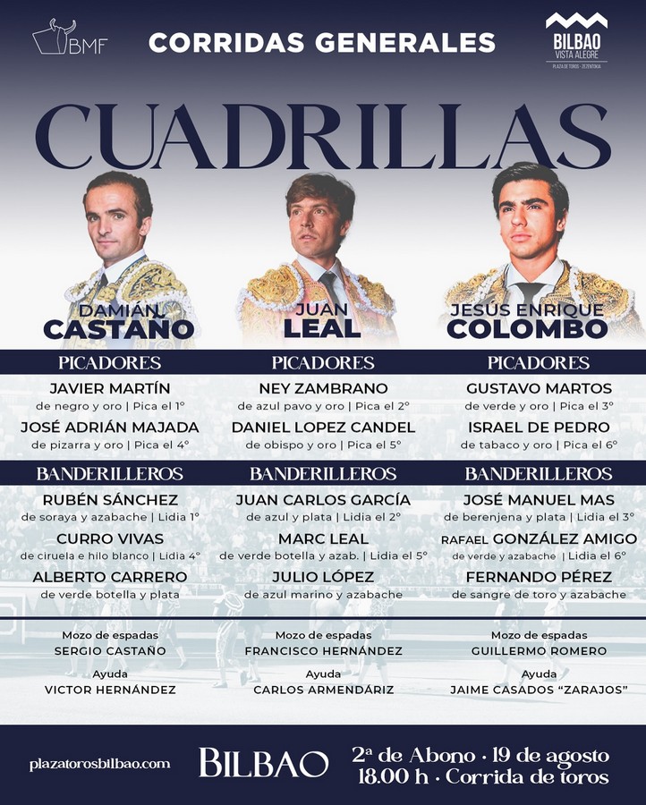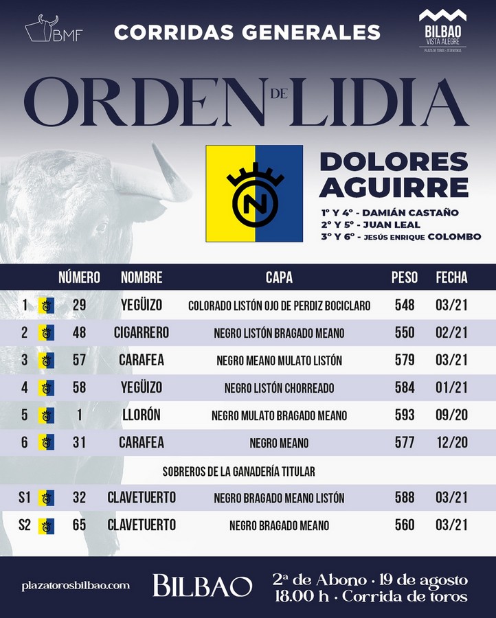 Orden de lidia para la primera corrida de la Aste Nagusia