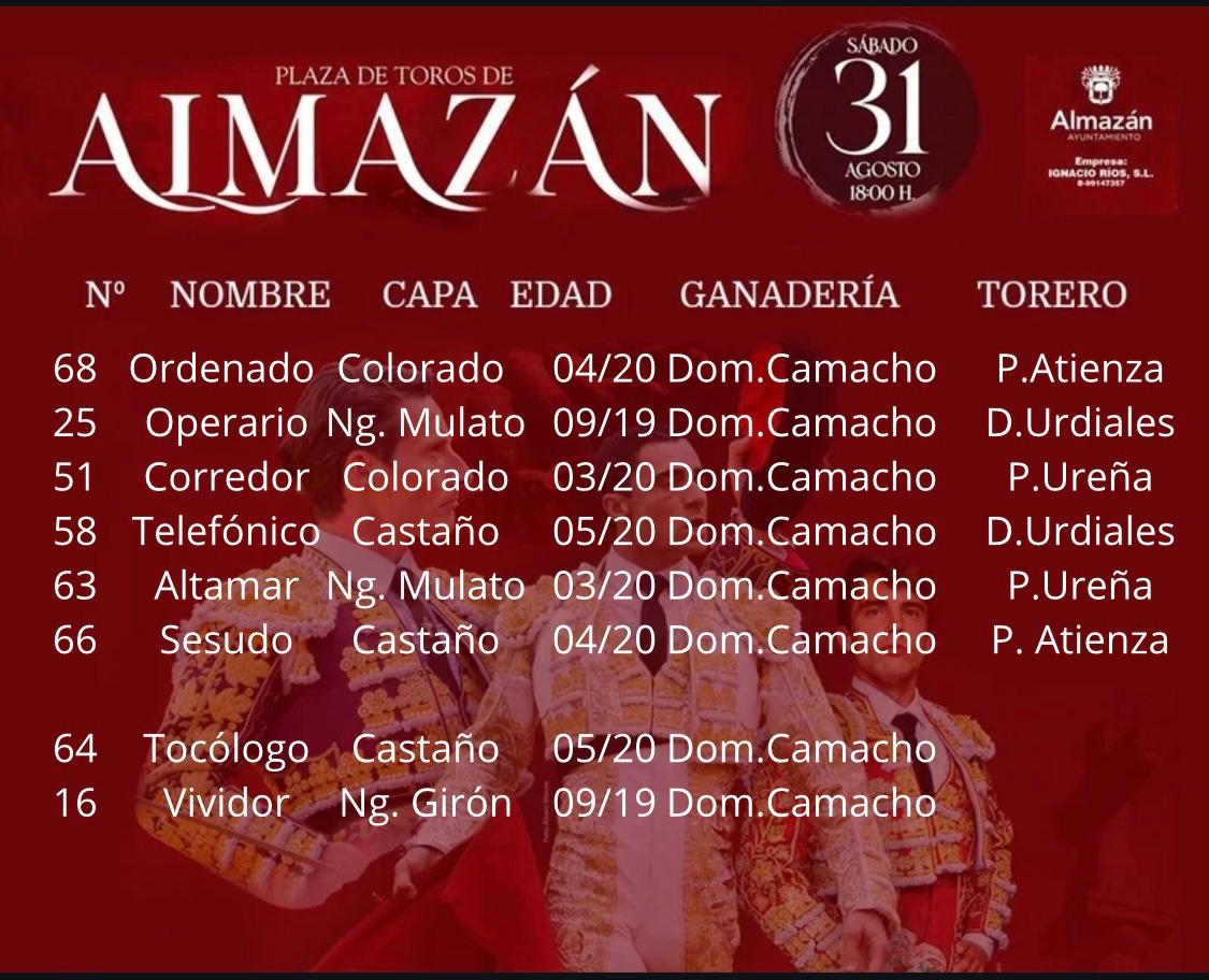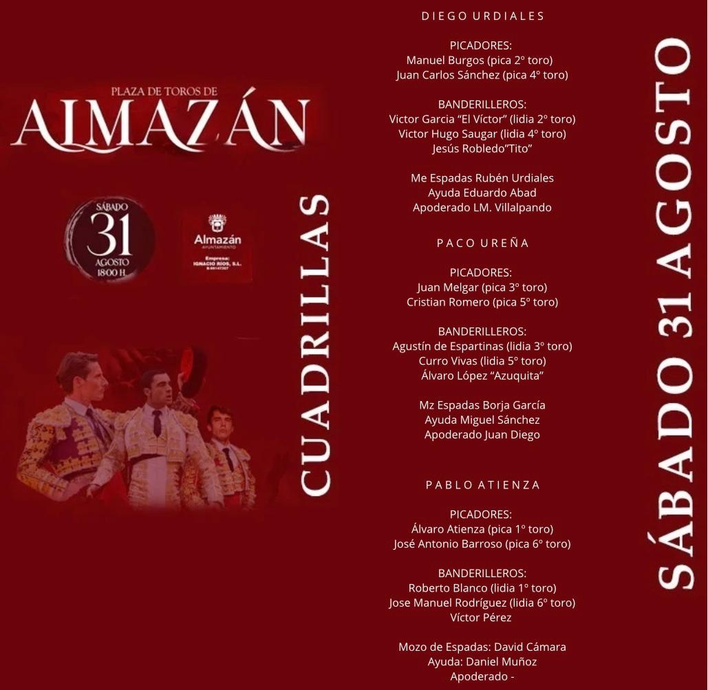 La localidad soriana de Almazán celebrará esta tarde una corrida de toros en la que tomará la alternativa Pablo Atienza, de manos de Diego Urdiales y en presencia de Paco Ureña frente a toros de Domínguez Camacho