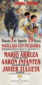 Sábado 3 de agosto: 19:00 horas. Novillos de Rocío de la Cámara y Cortijo de la Sierra para Mario Arruza, Aarón Infantes y Javier Zulueta.