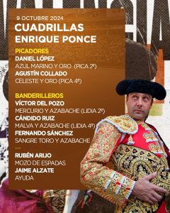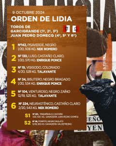 09 Oct ActualidadPonce se despide con ‘Bisutero’, de Juan Pedro Domecq Posted on 09/10/202409/10/2024 by Redacción Enrique Ponce se despedirá esta tarde de los ruedos en Europa en la tradicional corrida del Día de la Comunidad Valenciana. El de Chiva alternará con Talavante y Nek Romero, que tomará la alternativa Orden de lidia y cuadrillas Ponce se despide con 'Bisutero', de Juan Pedro Domecq Ponce se despide con 'Bisutero', de Juan Pedro Domecq Ponce se despide con 'Bisutero', de Juan Pedro Domecq Ponce se despide con 'Bisutero', de Juan Pedro Domecq Prensa Toros Valencia Redacción Orden de lidia para la corrida concurso de Zaragoza Golpe en la mesa de Félix San Román en Chapinería