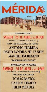 Mérida se convertirá y acaparará las miradas del mundo taurino los días 25 y 26 de abril. Desde la empresa confiamos, en que el público dará su respaldo a estos importantes carteles que hoy presentamos. Se trata de un serial que conjuga a la perfección la madurez con la juventud, asegurándose así la competencia y rivalidad entre todos ellos.