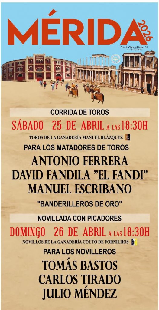 “La empresa Toros La Merced, dirigida por José Luis Pereda, ha organizado una importante Feria de Primavera en Mérida, fruto de un trabajo serio, responsable y comprometido con la afición. El ciclo taurino contará con una terna de especialistas en el tercio de banderillas, lo que garantiza un espectáculo de gran nivel. También habrá una novillada protagonizada por tres jóvenes promesas de gran proyección.