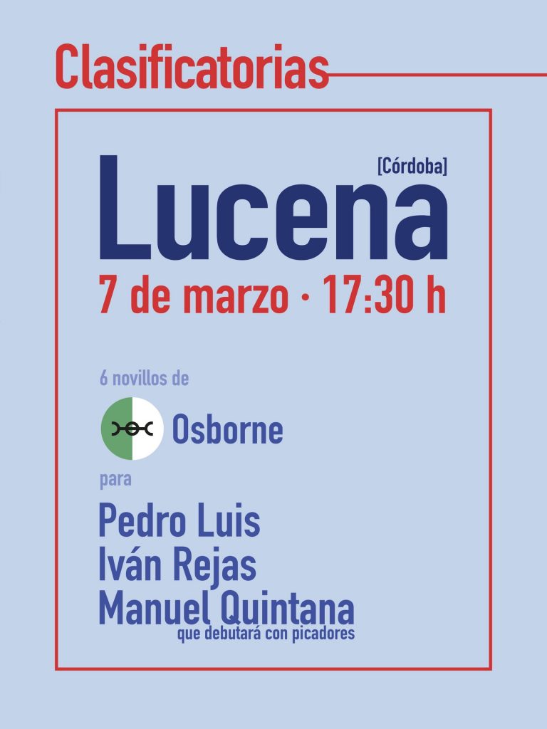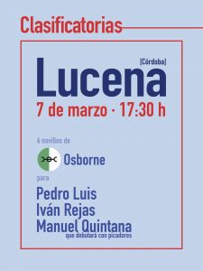 - Sábado 7 de marzo, Lucena: Novillos de Osborne para Pedro Luis, Iván Rejas y Manuel Quintana, que debuta con picadores.