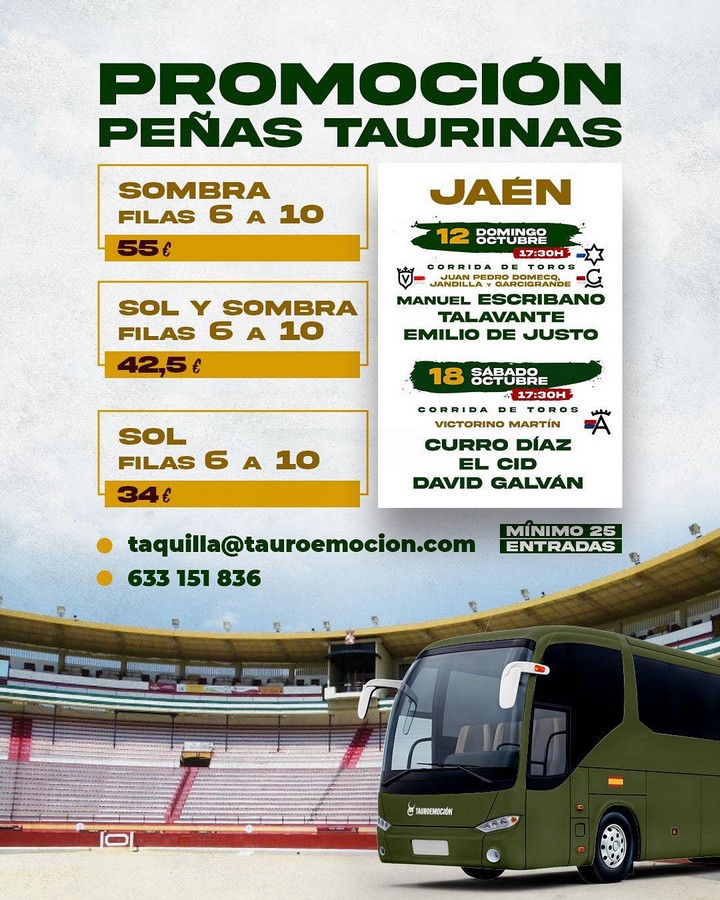 La empresa Tauroemoción, con el fin de facilitar que todos los aficionados puedan ir a los toros, ha puesto en marcha una promoción para peñas y asociaciones con motivo de la Feria Taurina de San Lucas de Jaén.
