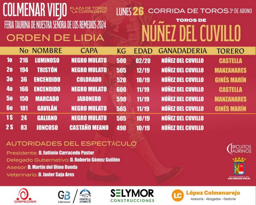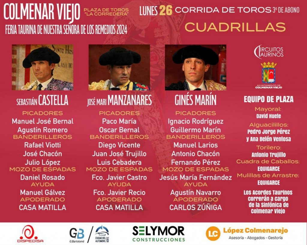Colmenar Viejo vivirá esta tarde la tercera corrida de toros de la Feria de Nuestra Señora de los Remedios. Se anuncian los diestros Sebastián Castella, José María Manzanares y Ginés Marín frente a reses de Núñez del Cuvillo