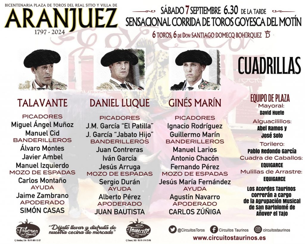 El municipio madrileño de Aranjuez festeja con una corrida goyesca sus Fiestas del Motín. Ante reses de Santiago Domecq harán el paseíllo Alejandro Talavante, Daniel Luque y Ginés Marín, que sustituye a Morante de la Puebla