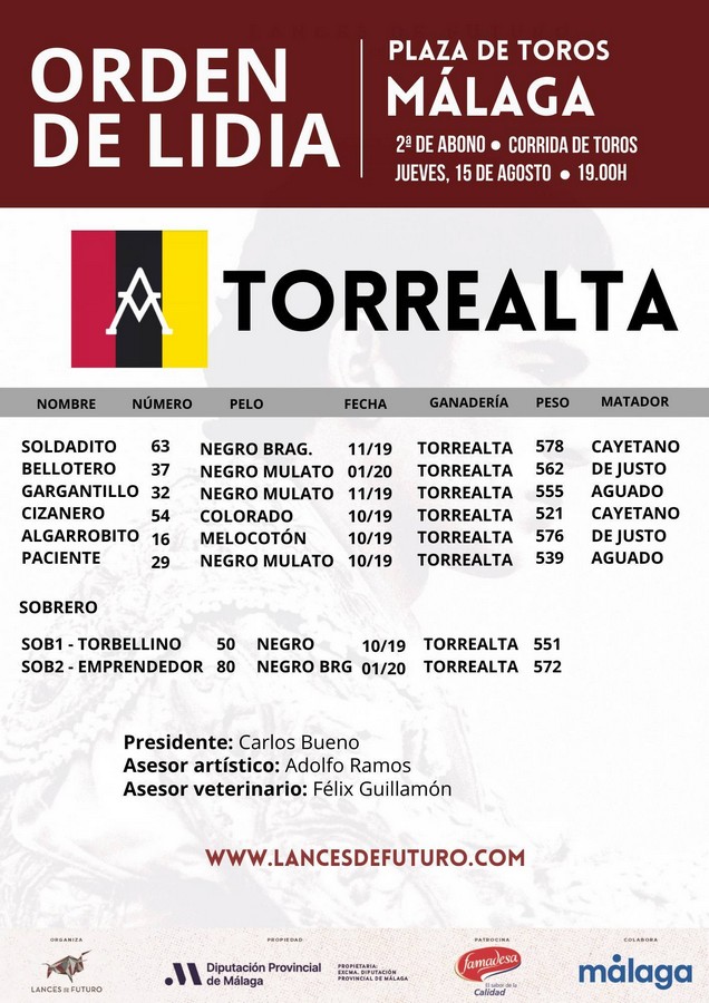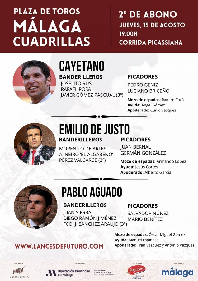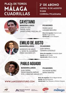 La Malagueta será escenario esta tarde de la Corrida Picassiana, que se suspendió la pasada Semana Santa por lluvia, y que hoy se celebra. Trenzarán el paseíllo Cayetano, Emilio de Justo y Pablo Aguado, que darán cuenta de animales de Torrealta
