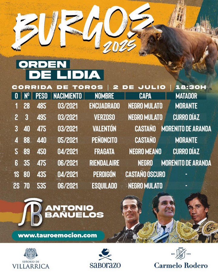 02 Jul ActualidadSorteo de los toros de Antonio Bañuelos para Burgos Posted on 02/07/202502/07/2025 by Redacción Sorteo de los toros de Antonio Bañuelos para Burgos Morante de la Puebla, Curro Díaz y Morenito de Aranda componen la terna para esta última corrida del ciclo Orden de lidia Sorteo de los toros de Antonio Bañuelos para Burgos Prensa Tauroemoción Redacción Fabio Jiménez, Bruno Aloi y Pedro Luis, ante la segunda nocturna Se completan las semifinales de Castilla y León