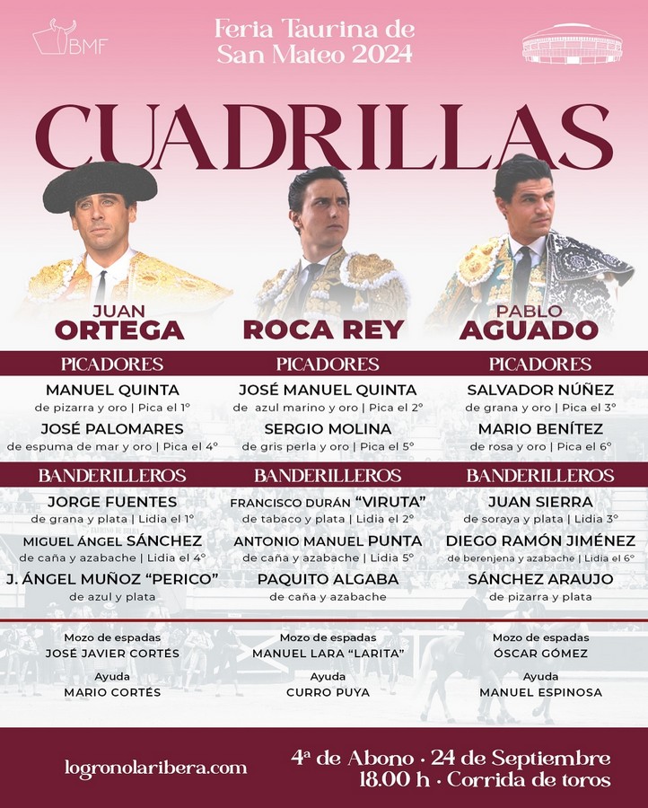 Cuarta corrida de la Feria de San Mateo de Logroño. Juan Ortega, Roca Rey y Pablo Aguado se enfrentarán a astados de Fuente Ymbro