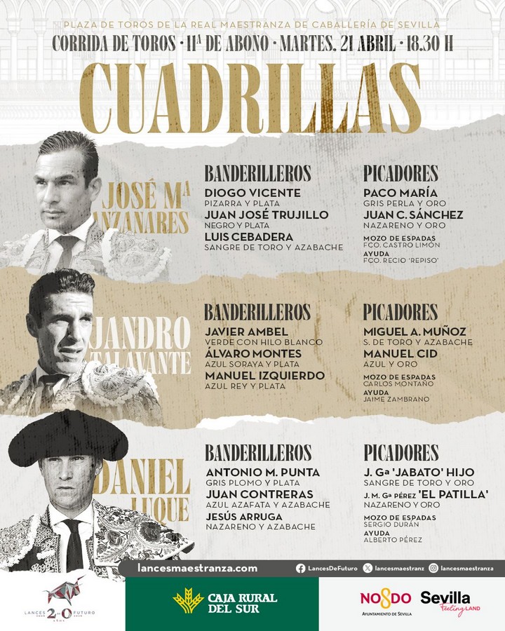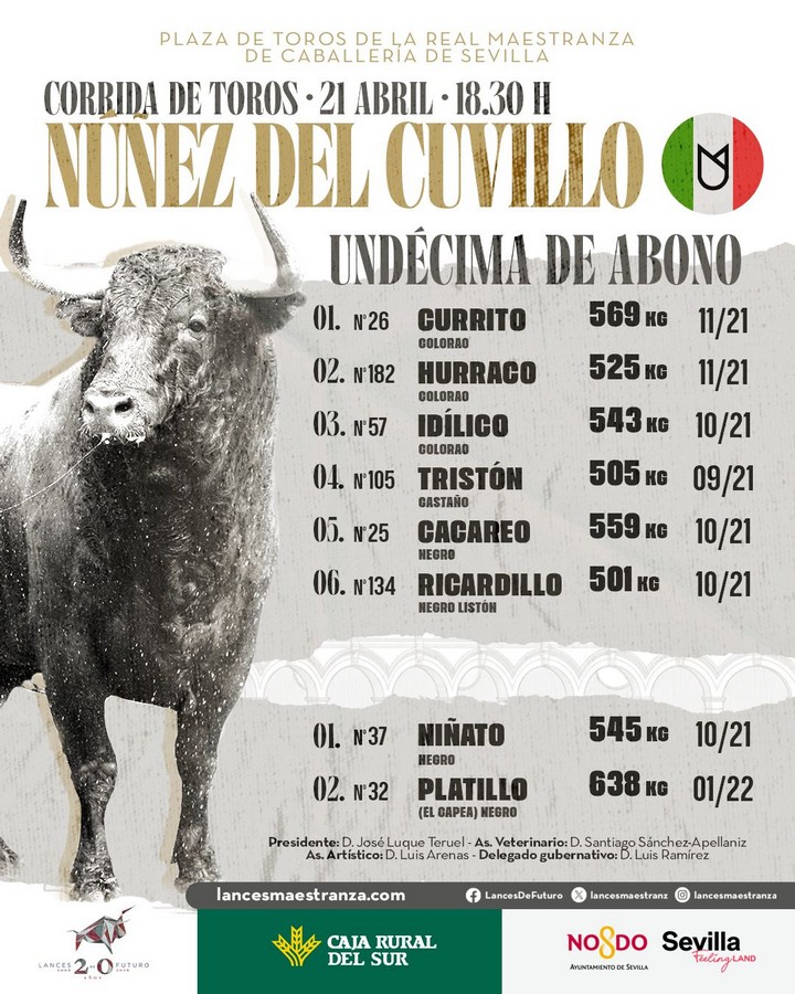 21 Abr ActualidadSorteo de los toros de Núñez del Cuvillo para Sevilla Posted on 21/04/202621/04/2026 by Redacción Sorteo de los toros de Núñez del Cuvillo para Sevilla Darán cuenta de ellos José María Manzanares, Alejandro Talavante y Daniel Luque Orden de lidia, cuadrillas, fotos de los toros y vídeo Sorteo de los toros de Núñez del Cuvillo para Sevilla Sorteo de los toros de Núñez del Cuvillo para Sevilla Sorteo de los toros de Núñez del Cuvillo para Sevilla Sorteo de los toros de Núñez del Cuvillo para Sevilla Sorteo de los toros de Núñez del Cuvillo para Sevilla Sorteo de los toros de Núñez del Cuvillo para Sevilla Sorteo de los toros de Núñez del Cuvillo para Sevilla Sorteo de los toros de Núñez del Cuvillo para Sevilla Vídeo Redacción Luis Gerpe ante el reto de Palha este domingo en Las Ventas Sahagún ya tiene cartel para su corrida de toros