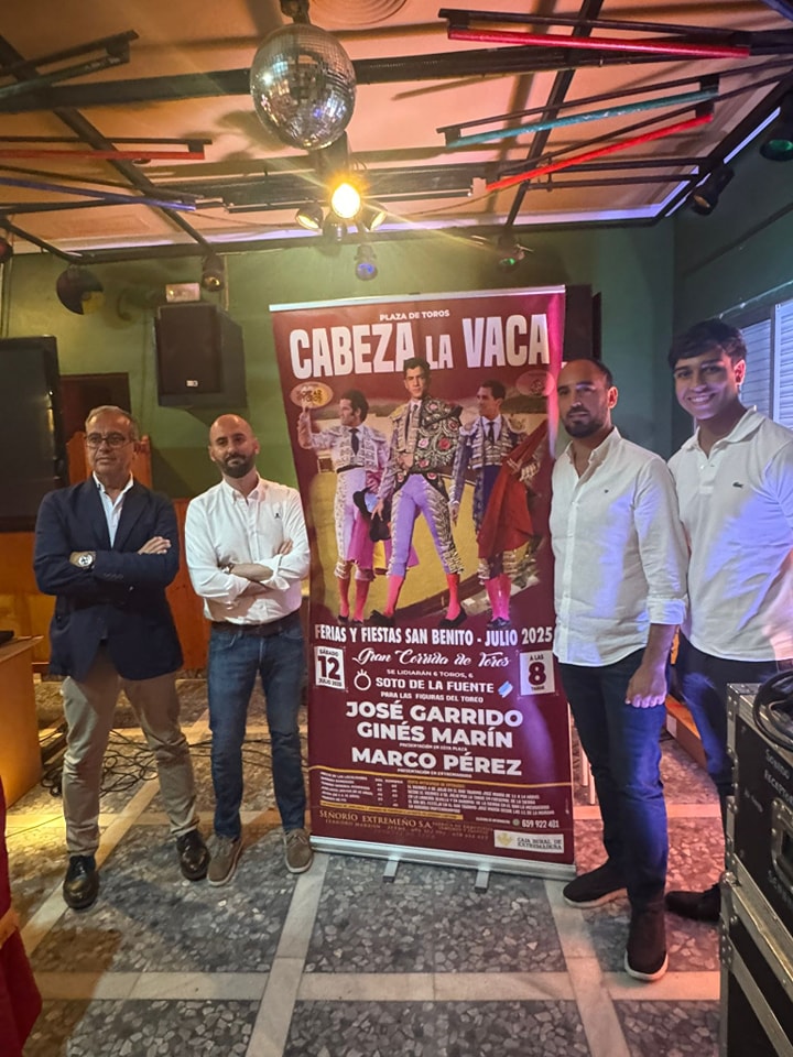 El festejo de este año contará con la presencia de Marco Pérez, joven promesa del toreo que debuta como matador en Extremadura tras tomar la alternativa en Nimes. Le acompañarán dos figuras del toreo extremeño: José Garrido, que regresa a Cabeza La Vaca tras una gran faena en 2024, y Ginés Marín, que debuta como matador en esta plaza extremeña, tras su paso como novillero hace 10 años. Se lidiarán una corrida de Soto de la Fuente.