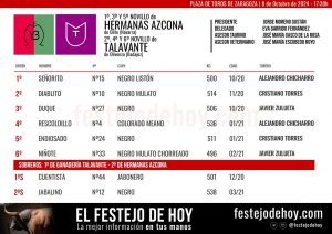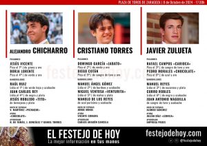 Segunda novillada de la Feria del Pilar de Zaragoza, en la que se lidiarán tres astados de Hnas. Azcona y tres de Talavante para Alejandro Chicharro, Cristiano Torres y Javier Zulueta