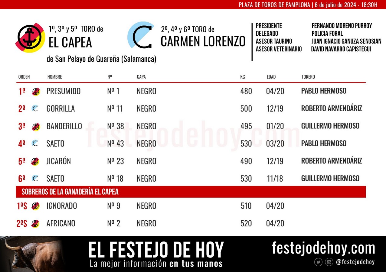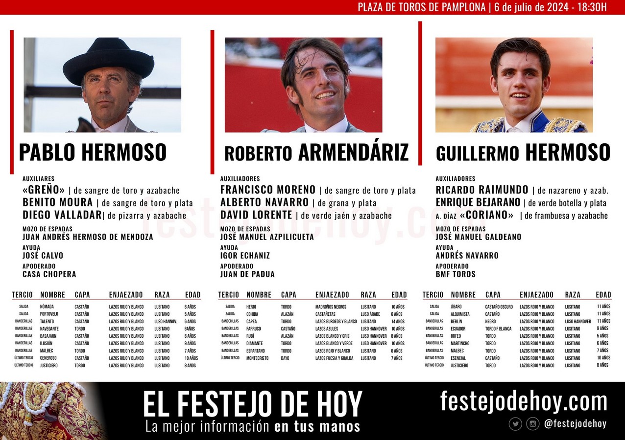 Tras la accidentada novillada de ayer, que fue suspendida a la muerte del segundo por la intensa lluvia, hoy se celebra en Pamplona la ya tradicional corrida de rejones, en la que se despedirá de la afición pamplonesa Pablo Hermoso de Mendoza, que actuará junto a Roberto Armendáriz y su hijo Guillermo frente a reses de El Capea y Carmen Lorenzo
