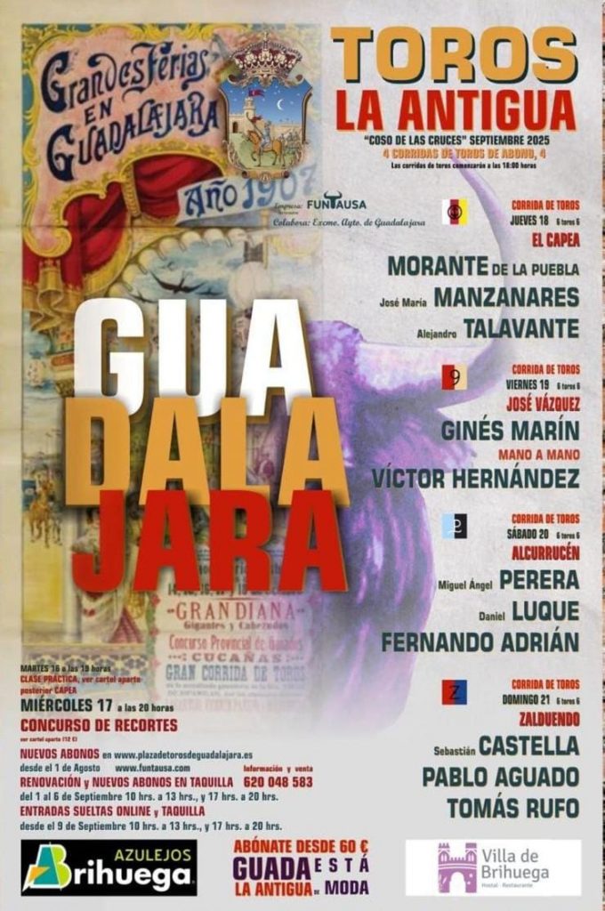 La empresa Funtausa ha anunciado en el día de hoy la composición de la Feria de La Antigua de Guadalajara, que tendrá lugar entre el 16 y el 21 de septiembre y que consta de cuatro corridas de toros, un concurso de recortes y una clase práctica.