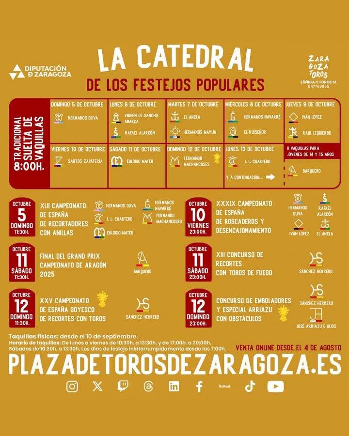 Esta tarde se han dado a conocer los carteles de la Feria del Pilar de Zaragoza 2025, que tendrá lugar del sábado 4 al lunes 13 de octubre. Desglosada por espectáculos está compuesta por seis corridas de toros, una corrida de rejones, dos novilladas picadas y una sin caballos. Junto a esto, también hay preparada una amplia y variada programación de festejos populares.