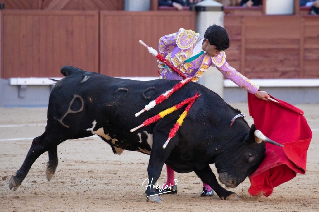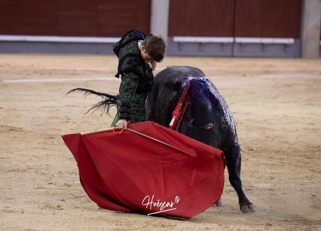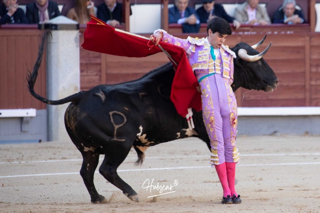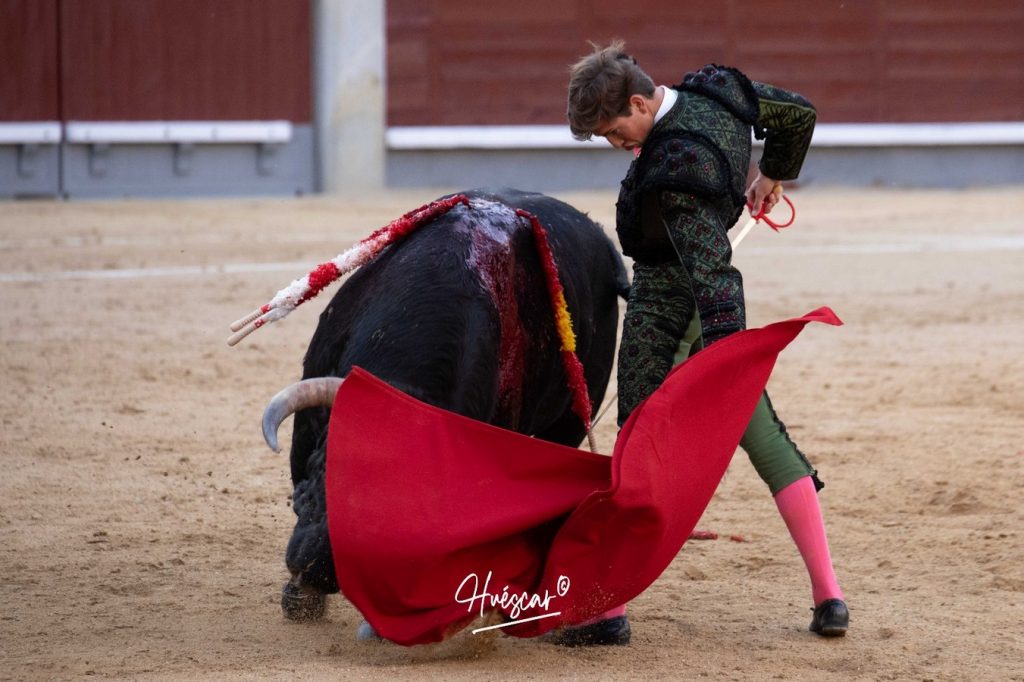 1º Sobrero ‘Zambombero’, Nº 78 (Alcurrucén). Ganándole terreno Aarón Palacio al segundo bis de la tarde, con decisión y buenas maneras. Cumple en el peto el de Alcurrucén, sin apretar demasiado. Quite por delantales de Javier Zulueta, abrochando con una magnífica media. Buena lidia de Juan Sierra. Firme el novillero maño, ligando los muletazos en un palmo de terreno con ajuste. Obediente, con movilidad, transmisión el ejemplar de Alcurrucén, mejor por el derecho. Por uno y otro lado, tiraba un derrote al final del viaje, logrando correr la mano con temple en bastantes ocasiones Aarón Palacio. Le faltó entrega al burel de la ganadería toledana, que acabó la faena queriendo marcharse de la jurisdicción del torero. Epílogo el trasteo con ayudados por alto. Pinchazo y estocada. Palmas.