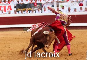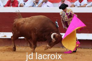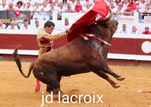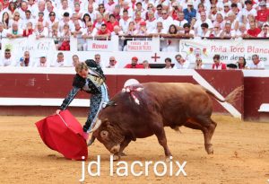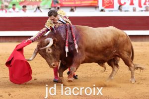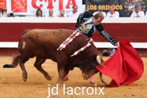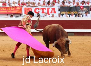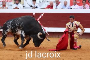 Plaza de toros de Dax (Francia). Corrida de toros. Lleno. Astados de la ganadería de Pedraza de Yeltes, el 6º, «Deslumbrante», nº 34, premiado con la vuelta al ruedo.