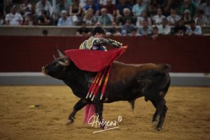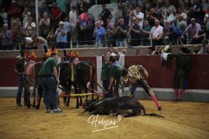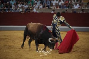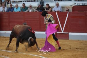 Con mucha enjundia y buen juego de brazos saludó al sexto Alejandro Chicharro. Humilla bastante el cornúpeta, tanto en las telas como en el peto. Excelente lidia de Juan Carlos Rey, desmonterándose junto a sus compañeros, Raúl Ruiz Bonilla y Jesús Robledo “Tito”, que expusieron y se lucieron con los palitroques. Bravo, encastado y con mucha entrega el astado de Conde de Mayalde, al que cuajó de principio a fin Chicharro, desde el mismo inicio de faena en los medios toreando en redondo de rodillas. Obra rotunda, maciza, intensa y llena de verdad del espada madrileño, que hilvanó series por uno y otro pitón notables, rematando atrás de la cadera y rompiendo por abajo a su antagonista, con media pañosa arrastrando por la arena. Finalizó su labor con bernadinas y unos torerísimos muletazos a dos manos para cerrar al utrero. Estocada arriba, algo trasera, entrando en rectitud. Dos orejas para Alejandro Chicharro y vuelta al ruedo para ‘Fortunito II’, nº 28.