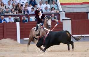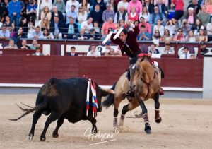 3º ‘Listoncillo’, Nº 35. Con ‘Guitarra’ recibió Lea Vicens al tercero de la suelta, que mostró calidad de salida, humillando bastante al llegar al caballo. Ya en banderillas, con ‘Diluvio’ colocó hasta tres rehiletes, destacando el tercero de los palitroques. Con ‘Pantera’ subió de tono la faena, conectando más con los tendidos del coso venteño. A lomos de ‘Greco’ dejó Lea Vicens dos rosas sobre el morrillo de su antagonista. Resultó complicado entrarle a matar al animal de San Pelayo, muy cerrado en tablas. Rejonazo trasero y varios descabellos. Silencio tras aviso.