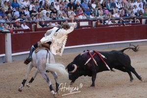 2º ‘Ladrillero’, Nº 37. Con ‘Querido’ colocó Diego Ventura dos rejones de castigo frente a un cornúpeta noblón en esas primeras arrancadas. Seguidamente, a lomos de ‘Nómada’ dejó dos banderillas, ante un ejemplar de mucha nobleza, de clase y de ritmo en su embestida, si bien algo falto de chispa y de mayor motor. Montando a ‘Lío’ formó un alboroto en los tendidos, dejándose llegar mucho los pitones del toro, metiéndose por dentro para que el toro se viniera. Dos banderillas dejó en el morrillo, con ‘Bronce’, prendió un par de banderillas a dos manos en el centro del ruedo, quitándole la cabezada al caballo. Con el equino del último tercio, ‘Brillante’, colocó una rosa justo antes de tomar el rejón definitivo. Pinchazo y rejonazo. Ovación.