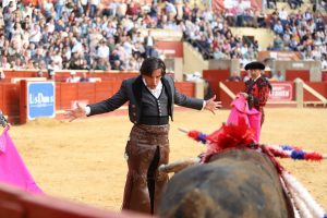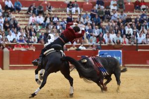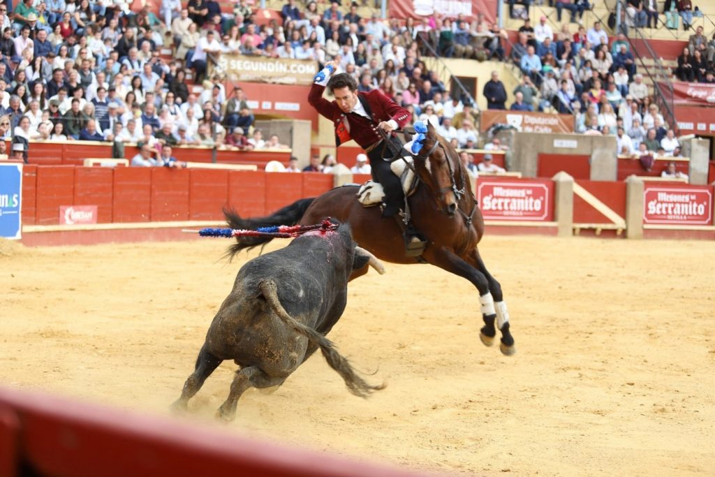 A continuación, con “Nómada”, protagonizó uno de los momentos más impactantes de la faena, galopando de costado y adentrándose en terrenos mínimos, prácticamente sin espacio para la salida, en una demostración de valor y maestría. Ejecutó banderillas a una mano, de frente, llevando los pechos del caballo hasta los pitones del toro, en un alarde de pureza. El clímax llegó con “Sueño”, en una intervención que rozó lo extraordinario. Las banderillas al quiebro, realizadas a escasa distancia -apenas un metro-, destacaron por su belleza y perfección en la ejecución, dejando una obra sin parangón. Posteriormente, con “Bronce”, elevó aún más la intensidad del espectáculo al clavar un par sin cabezal que desató la locura en los tendidos. Con el mismo caballo, completó un vibrante carrusel de banderillas cortas al violín y culminó con un ramillete de rosas colocado en lo alto, en un gesto de gran torería.