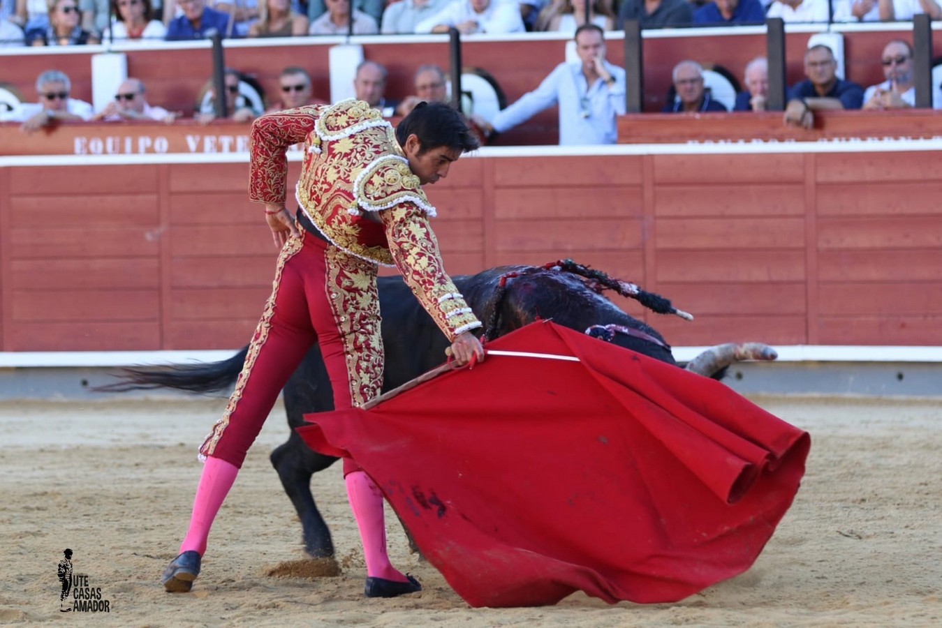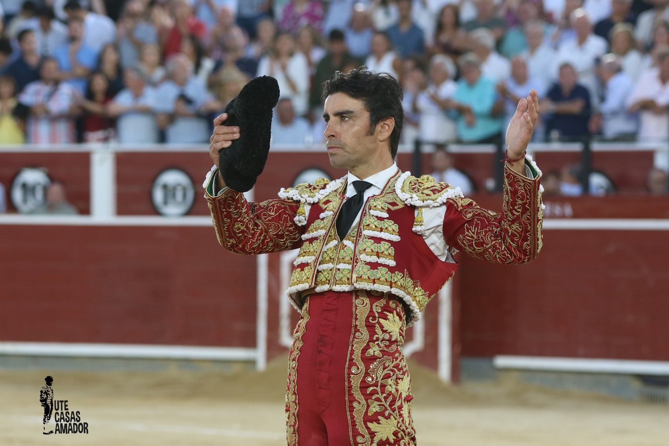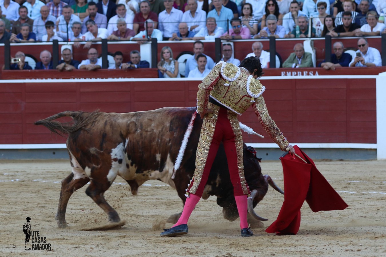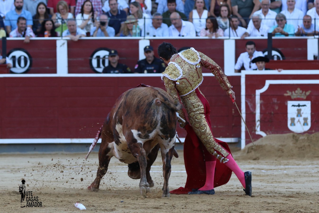 Con un manojo de buenas verónicas saludó Borja Jiménez al tercero de la corrida, un toro con casta y transmisión pero con limitada clase y entrega. También empezó faena el matador sevillano con pases cambiados por la espalda, consiguiendo los momentos álgidos del trasteo con la mano derecha. Asentado, encajado el de Espartinas, que cuajó series de gran profundidad y pureza. La verdad y la disposición total de Borja Jiménez fueron recompensadas con un apéndice después de dejarlo para las mulillas de una estocada entera.
