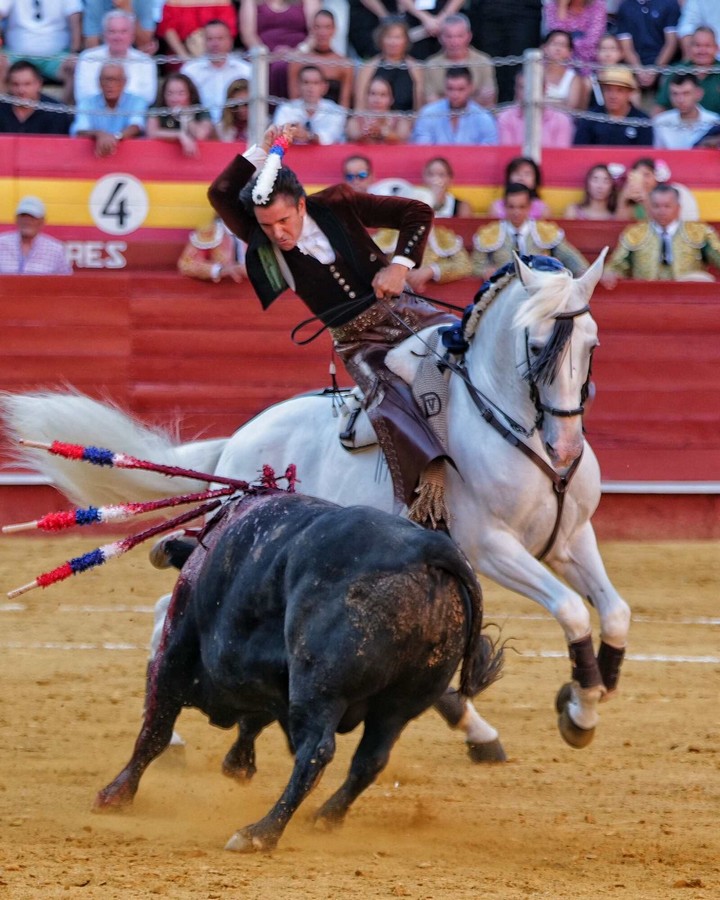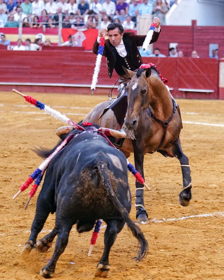 1º ‘Ranitita’, nº 28. (Cortés de Moura). A lomos de ‘Guadalquivir’ colocó Diego Ventura dos rejones de castigo, con el toro mostrando buen son tras la cabalgadura pero también no demasiado celo. Montando a ‘Quirico’ cogió vuelo la faena, prendiendo tres banderillas, al que templó a la perfección el rejoneador afincado en La Puebla del Río. Nobleza y ritmo en la embestida del animal de Cortés de Moura. Con ‘Lío’ remató una faena de gran altura, notable, dejando otros dos rehiletes en el morrillo de su antagonista. Hasta tres rosas colocó a lomos de ‘Brillante’, finiquitando al de Cortés de Moura de pinchazo y rejonazo arriba. Oreja.
