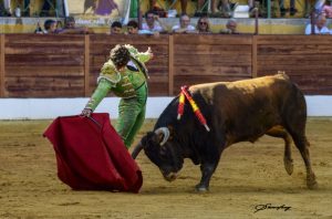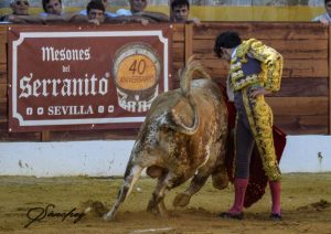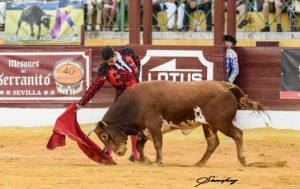 Farol de rodillas de Juan Jesús Rodríguez para saludar al que salió por chiqueros en quinto lugar, ‘Comejaras’. Prosiguió el recibo con verónicas muy despaciosas. Juanmi Vidal ‘El Melli’ realizó un quite por chicuelinas. Brindó su faena el joven torero de La Línea de la Concepción a David Gil, Secretario General de Interior de la Junta de Andalucía. Al pasarlo con la muleta en la mano derecha, sufrió tremenda voltereta, sin consecuencias. Labor a más de Juan Jesús Rodríguez, que terminó por imponerse con ganas, garra, raza y pundonor a su enemigo, que no fue fácil sino exigente y encastado. Rodríguez sacó de su interior mucha capacidad y conjuntó series de muletazos por ambos lados importantes, conduciendo con poder y temple la embestida del eral de Los Millares. Pinchazo y dos intentos más con el estoque. Oreja.