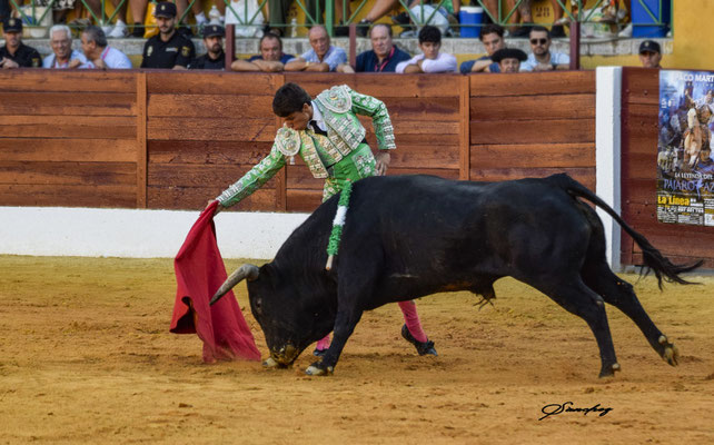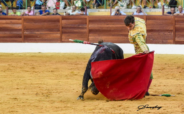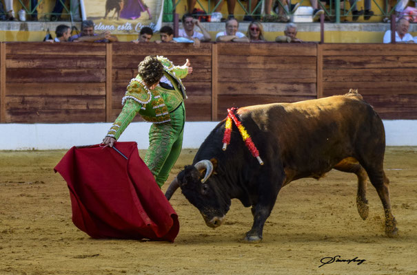 Garboso saludo a la verónica, queriendo embarcar bien la embestida, de Antonio Santana al segundo de la función, ‘Precioso’. Por chicuelinas quitó Gabriel García. Muy encajado, muy de verdad, asentado en los riñones toreó el joven torero de la Escuela Taurina ‘La Gallosina’. Mejores resultaron las series que instrumentó con la mano derecha, ya que por ahí el eral se fue más largo y con más franqueza. En cambio, por el izquierdo, echaba la cara arriba y les costó más ir hacia delante. Finalizó su faena Santana, con unas ceñidas manoletinas. Fueron necesarias varias entradas a matar, hasta dejar un espadazo bien colocado. Vuelta al ruedo tras petición.