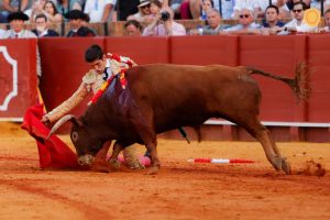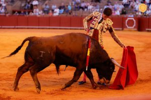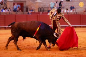 Palacio hizo el mejor toreo de capa de la tarde en el quinto. Primero a la verónica en el recibo, después en un galleo por chicuelinas y por último en un precioso quite por tafalleras. Brindó a El Tato y comenzó la faena de rodillas con bonitos muletazos por alto. Mostró buenas maneras en el toreo diestro y remató con buenos pases de pecho. También al natural se acopló y dejó momentos destacados, redondeando una actuación con fondo y forma. Excelente nivel y buenas sensaciones de este torero maño en su debut en Sevilla. Mató de estocada trasera y descabello y cortó una oreja.