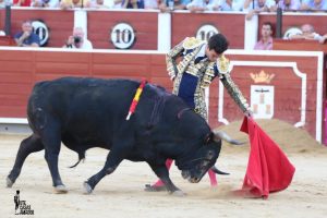 El quinto de la corrida no mostró demasiada fuerza en los primeros tercios, Con mucha torería, con unos ayudados por alto, inició el trasteo Juan Ortega. Al animal de la vacada madrileña le faltó motor y empuje, moviéndose con nobleza pero con poca transmisión. Aseado y templado el diestro de Triana pero sin poder redondear la obra por la condición apuntada de su enemigo. De la faena destacar las tandas instrumentadas con la mano zurda, por la mayor calidad del cornúpeta por ese lado. Ortega le dio tiempo entre serie y serie para que el toro embistiera con más recorrido y entrega. Ya con la espada de acero en la mano, ejecutó una gran serie de naturales, dando el pecho y citando de frente, exprimiendo al máximo al astado. Media estocada en lo alto. Oreja.