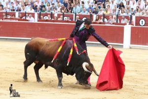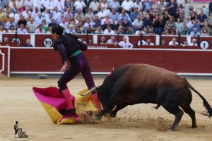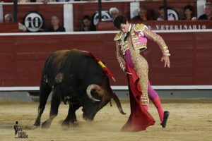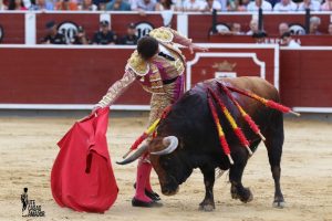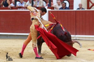 4º ‘Guardamonte’, nº 24. También se fue a portagayola Fortes en el cuarto de la tarde, siendo volteado con fuerza al no obedecer el astado para el farol que pretendía darle. Después le enjaretó un magnífico manojo de verónicas, de mucha pureza. Faena de peso del diestro malagueño, de entrega, de pureza, de autenticidad. Ni se miró Saúl en la herida que llevaba en la cara y que le llenaba de sangre esa parte del rostro. El trasteo destacó fundamentalmente por las series que instrumentó con la derecha, quedándose en el sitio, toreando con la panza y ofreciéndole los muslos una y otra vez. Seria actuación, sin concesiones a la galería de Fortes, al que le acariciaron los serios pitones de su antagonista en la parte final de su obra muleteril. Estocada a ley. Oreja.