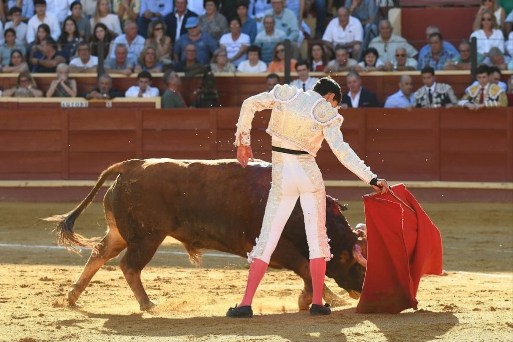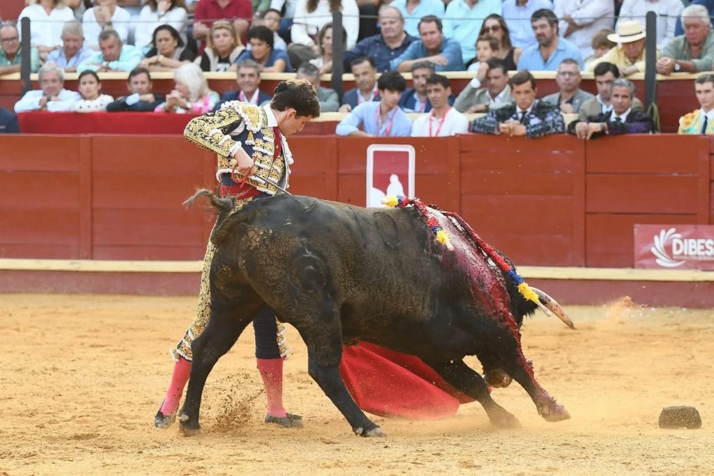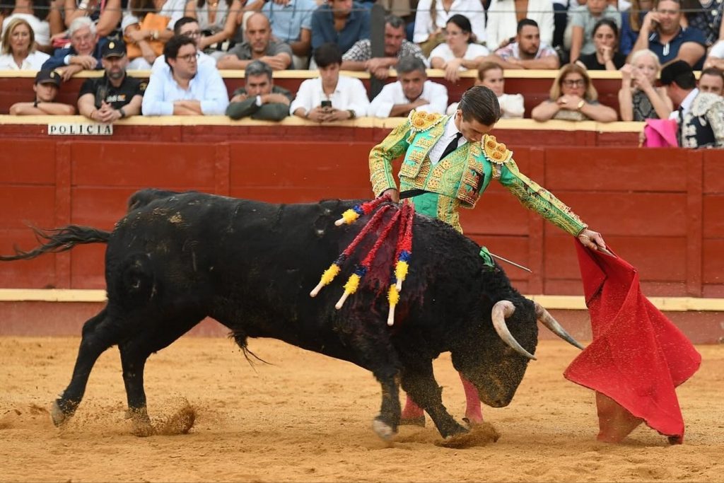 Con un variado saludo capotero recibió Álvaro Serrano al tercero de la tarde, con el que dejó una templada media plagada de lentitud y gusto en el quite. Con la muleta, el novillero madrileño anduvo con firmeza, pese al poco recorrido y a las sosas embestidas que presentaba el astado. Firmó lo más rotundo con la mano izquierda, con la que dejó muletazos hondos. Cerró la faena por molinetes, con rodillas en tierra, tras dejar antes una serie de mando con la diestra en redondo. Tardó en caer el de Fuente Ymbro, que necesitó toque de vergudillo tras varias estocadas. Oreja tras aviso para Álvaro Serrano.