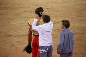 Al final de la vuelta al ruedo con las dos orejas, Morante se fue al centro del ruedo y con una intensa emoción y lágrimas en los ojos se cortó él mismo la coleta.