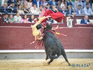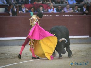 Muy protestado por la presencia justa para la plaza de Las Ventas, el quinto de la tarde. Abanto de salida, no se fija en los capotes. Poca fuerza muestra también el astado en varas. Juan Ortega ha sido cogido de fea manera en el inicio de faena a su oponente. El toro es muy deslucido, sin raza ni clase y más difícil por el pitón izquierdo, por dónde ha sido la cogida antes mencionada. Firme y muy de verdad el diestro sevillano, fundamentando el quehacer en la mano derecha, con varias tandas de categoría, muy asentado y toreando despacio. Media estocada tendida. Ovación con saludos.
