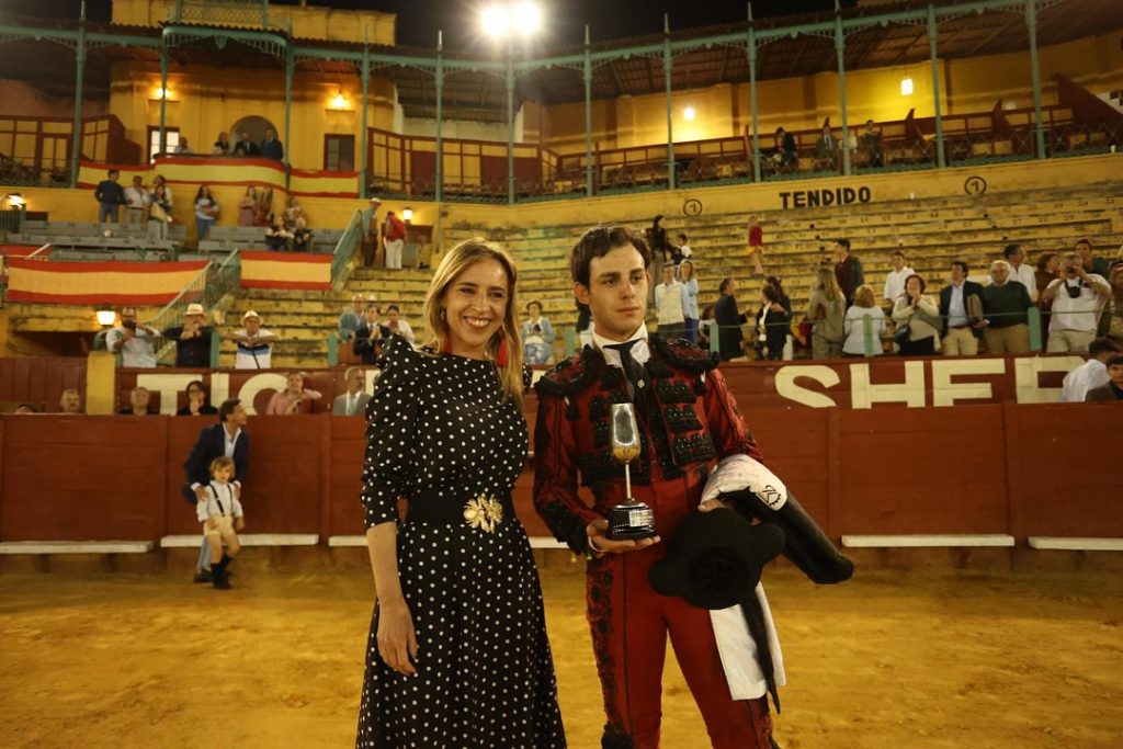 Ignacio Candelas se hace con el premio al novillero triunfador del festejo de hoy, entregado por la presidenta de la Diputación de Cádiz, Almudena Martínez.