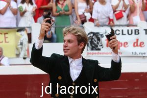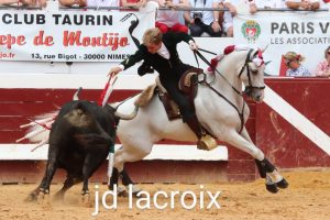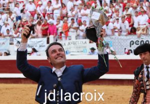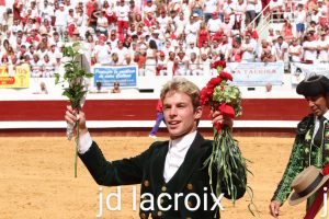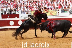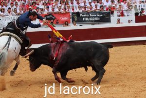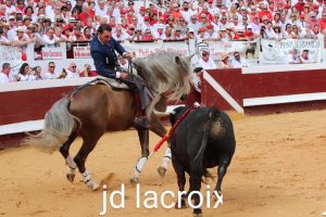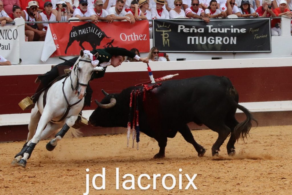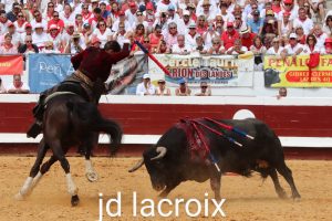 Plaza de toros de Dax (Francia). Corrida de rejones. Casi lleno. Reses de la ganadería de Murube, el 5º, «Hablador», nº 13, premiado con la vuelta al ruedo.